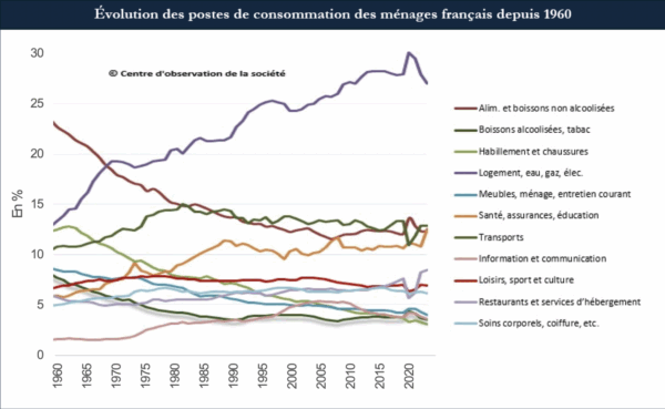 Source : Centre d’observation de la société, « Davantage de logement, moins d’alimentaire : l’évolution de la consommation des Français par poste de dépense », 19 septembre 2024