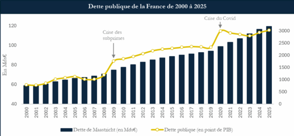 Depuis le début des années 2000, la trajectoire de la dette publique française est marquée par une hausse continue avec deux accélérations marquantes : la crise financière de 2008 puis la crise du COVID-19 en 2020. Lors de ces crises, la dette publique française a fortement augmenté en raison d’interventions exceptionnelles pour soutenir l’économie, notamment le sauvetage des banques, les plans de relance, la mise en place du chômage partiel et l’augmentation des dépenses de santé.