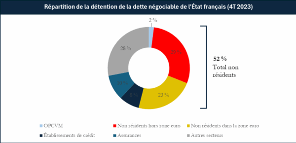 En 2023, 52 % de la dette publique française est détenue par des investisseurs non-résidents. Cette proportion est en constante progression en raison de la politique du « resserrement quantitatif de la politique monétaire » de la BANQUE DE FRANCE qui réduit progressivement ses détentions en titres des administrations publiques.