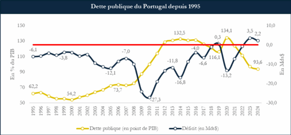 Lecture : En 1995, la dette publique du Portugal s’élève 62,2 % du PIB et le déficit s’établit à (6,1) Mds$.