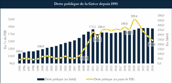 Lecture : En 1995, la dette publique de la Grèce s’élève 100,8 Mds$, soit 100,4 % du PIB.