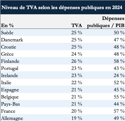 Lecture : En 2024, le taux de TVA en France s’élève à 20 % et les dépenses publiques représentent 57 % du PIB.