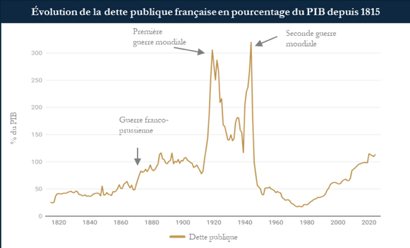 Aujourd’hui, la dette publique française représente 115,6 % du PIB, un niveau comparable à celui observé en 1885.