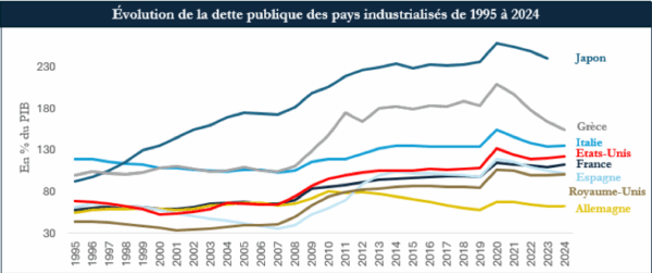 Lecture : En 2024, la dette publique française représente 115,6 % du PIB.