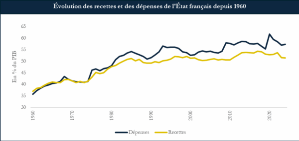 Lecture : En 2024, les dépenses publiques françaises représentent 57,3 % du PIB et les recettes 51,4 % du PIB.