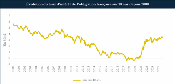 Lecture : En 2025, la France emprunte à un taux sur 10 ans qui s’élève à 3,45 %.