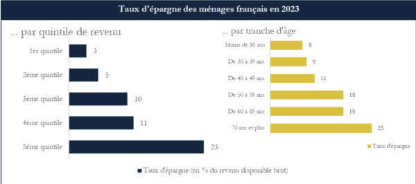 Lecture : En 2023, les ménages du cinquième quintile épargnent 28 % de leur revenu disponible brut et les ménages de moins de 30 ans épargne 8 % de leur revenu disponible brut.