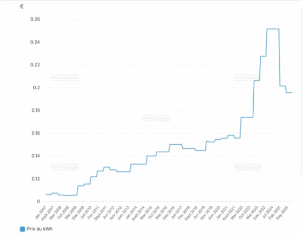 Lecture : Entre juillet 2024 et septembre 2025, le prix du kWh a diminué d’environ 20 %.