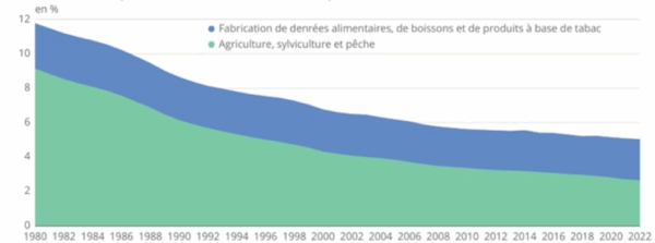 Depuis le début des années 1980, la part de l’agriculture dans l’emploi total a fortement reculé, passant de 9,1 % en 1980 à seulement 2,7 % en 2022.