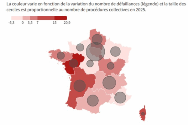 Lecture : Les Pays de la Loire et la Nouvelle-Aquitaine, qui affichent respectivement une hausse de 21 % et de 10 % de défaillances, sont les plus touchés.