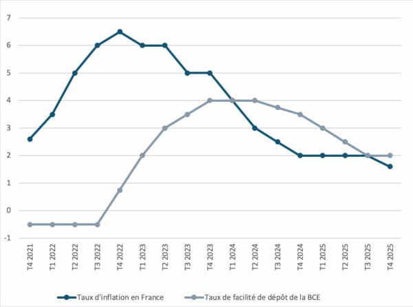 Lecture : En janvier 2025, le taux d’inflation en France était de 2 %, celui de dépôt de facilité de la BCE s’élevait à 3%.