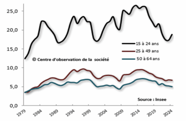 Source : « Depuis 40 ans, le taux de chômage des jeunes demeure à un niveau élevé » 26 septembre 2025, OBSERVATION SOCIETE