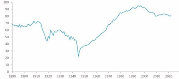 Productivité du travail au sein de l’Union européenne entre 1890 et 2024 en % du niveau des États-Unis